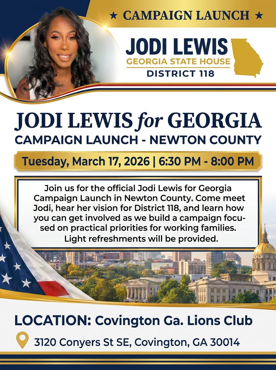 Join us for the official Jodi Lewis for Georgia campaign launch in Newton County. Come meet Jodi, hear her vision for District 118, and learn how you can get involved as we build a campaign focused on practical priorities for working families. Light refreshments will be provided.